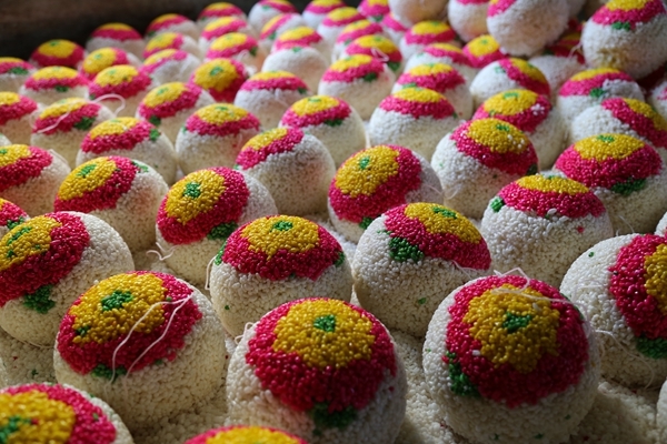 圓糖是米花糖的一種,是把米花和糖做成圓形,故而叫圓糖。圓糖曾經是每年春節彌渡人家家戶戶必備的年貨。記得小時候,春節前后到縣城去“趕集”,總是一雙眼睛像鉤子一樣的鉤著路邊攤點上的圓糖,盼望著大人能給買一個帶回去。如果真能如愿得到一個圓糖,回家就從蚊帳頂上牽一根線下來掛住圓糖,每天傻傻的看著,夢里都能笑醒。