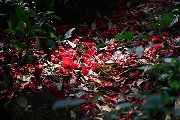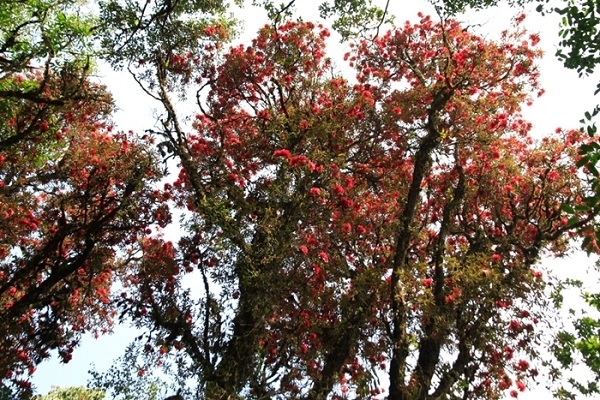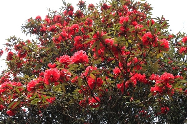 伴著聲聲清脆的鳥鳴,陽光變得和煦起來。一株、兩株、三株......許許多多血紅的杜鵑花兒在藍天白云下競相開放,火紅的杜鵑將古城山裝點得絢麗多彩。樹樹花開,花開樹樹。一團團、一簇簇,如烈焰騰空,燃燒成初春獨特的芳華。每年的一次怒放,都將心中的愛盡情噴發。雖不是夏紅,卻比夏紅來得猛烈、來得火熱。似熱血沸騰,更如情思翻滾,茫茫林海的平靜被打破了,光亮了另一個世界。(龍紀宣)