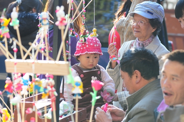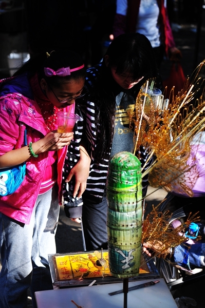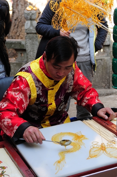 金殿廟會和各地的廟會差不多,非常熱鬧。從山門口到鐘樓,再到金殿后門,道路兩旁擺滿了各式攤點(diǎn),幾乎昆明所有的特色小吃和民間特色工藝品都可以找到,尤其是糖畫、捏面人、吹糖人等特色傳統(tǒng)商品讓游人們仿佛一下回到了幾十年前,讓人在大飽口福之余也開了眼界。
