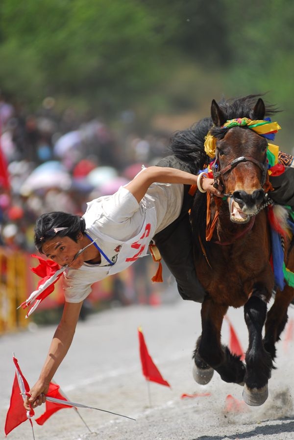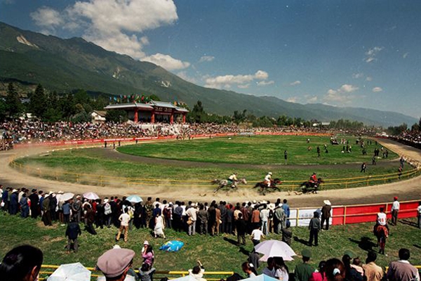 大理三月街賽馬歷史悠久,《徐霞客游記》中對三月街賽馬盛況曾進行過描述:“余乃仍由西門西向一里半,入演武場,俱結棚為市,環錯紛紜。其北為馬場,千騎交集,數人騎而馳于中,要隊以覘交下焉。”賽馬大會上,來自全國各地的優秀騎手進行跑馬射箭、飛馬拾紅等比賽,給觀眾帶來一場難得的視覺盛宴。
