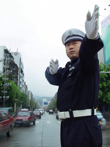 標準的手勢,堅定的目光,風雨無阻,他頭上的國徽,在陽光下閃閃發光。