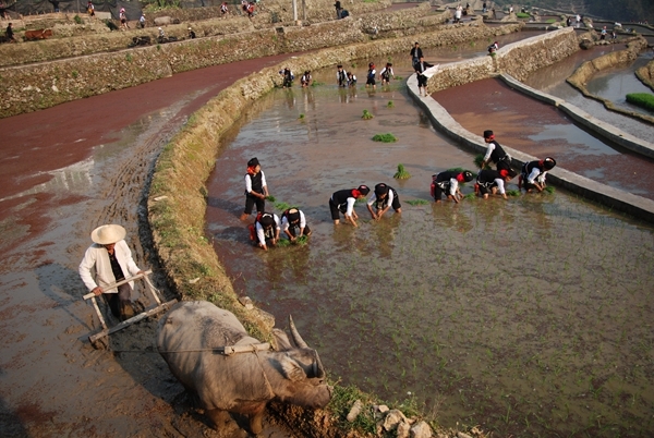 播種季節,田野里一片忙碌的景象,插下的秧苗是莊稼人來年的希望。