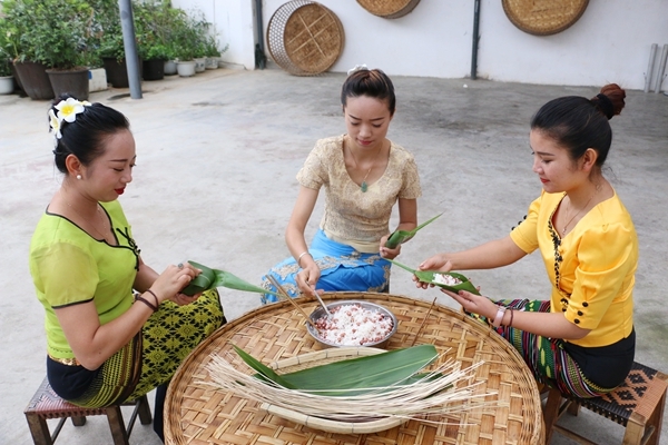 在隴川縣,傣家人早早就準(zhǔn)備好了新鮮的食材。此時(shí),他們?nèi)寮胰司墼谝黄穑ハ嘟淌诎刈拥募记?,根?jù)自己的口味喜好把花生、臘肉、大棗精心的放到糯米里,再用棕葉包緊。在家人團(tuán)聚時(shí)享受一番美食,就是傣家人最幸福的事。