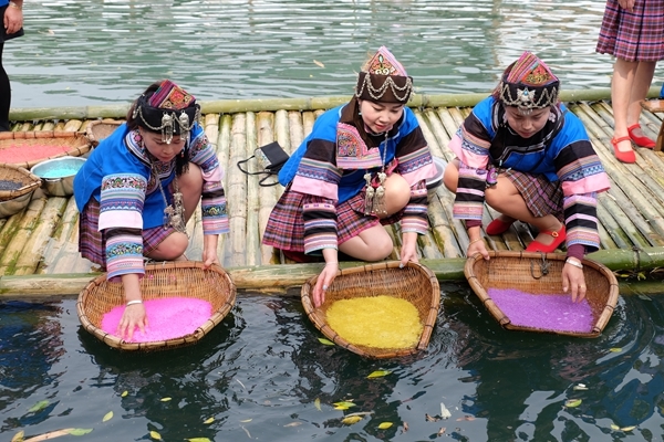 在師宗縣,花米飯是壯家人端午節(jié)必備的食材。黃、綠、粉、紫、藍(lán)五色分別代表了主食、蔬果、肉類、零食、乳制品五類食品,五種顏色也祈福來年五谷豐登。