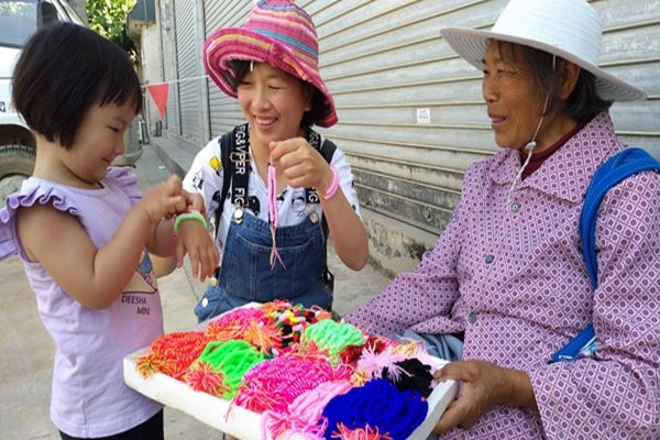“端午到,戴彩串”是施甸縣端午節(jié)的傳統(tǒng)習(xí)俗。此時(shí),老人們就用各種色彩的棉線編制成各式花色的彩色手串,將彩串一對一對的戴在兒孫的手上,以此祈求兒孫健康平安。