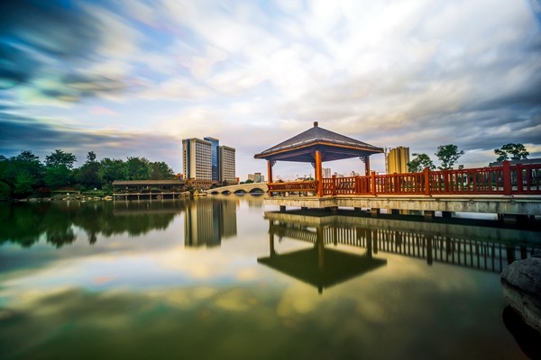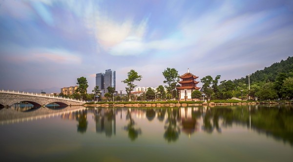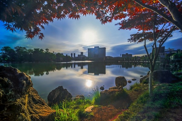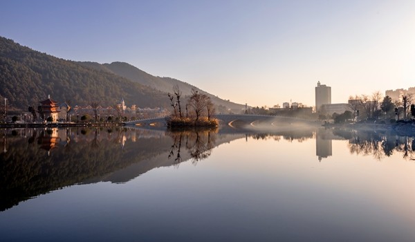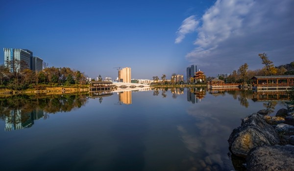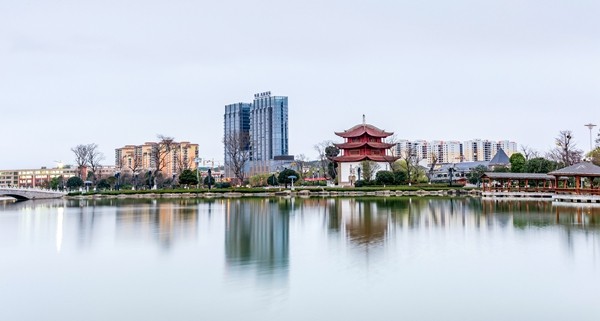 古樓大廈遙相望,倒映交融平湖中