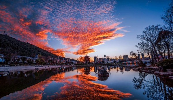 登樓遙看霞光舞,湖中倒映似馬奔