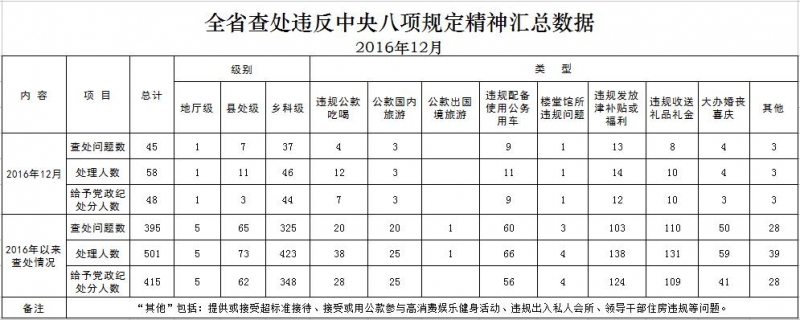 2016年12月,全省各級紀檢監察機關持續加大監督執紀問責力度,查處違反中央八項規定精神問題45起,處理58人,給予黨政紀處分48人。從查處問題類別看,違規發放津補貼或福利問題13起,占28.89%;違規配備使用公務用車問題9起,占20%;違規收送禮品禮金問題8起,占17.77%;違規公款吃喝4起,占8.89%;大辦婚喪喜慶問題4起,占8.89%;公款國內旅游3起,占6.67%;樓堂館所違規問題1起,占2.22%;其他問題3起,占6.67%。