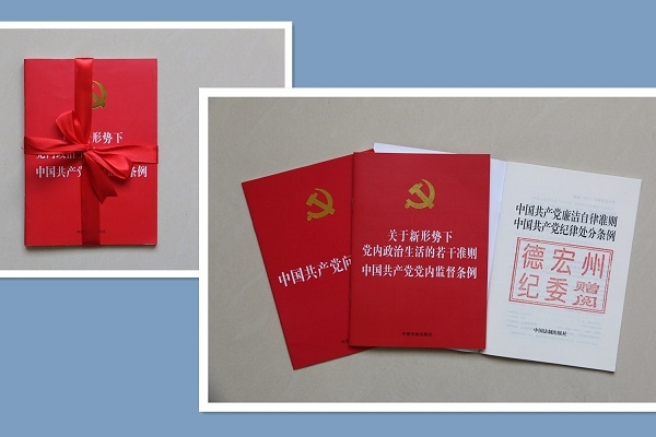 “這是一份非常珍貴的廉禮,我會認真學習、嚴格遵守、帶頭示范。” 2月28日,德宏州42名廳級領(lǐng)導(dǎo)干部收到州紀委贈送的“廉禮”——《中國共產(chǎn)黨廉潔自律準則》《中國共產(chǎn)黨紀律處分條例》合訂本、《關(guān)于新形勢下黨內(nèi)政治生活的若干準則》《中國共產(chǎn)黨黨內(nèi)監(jiān)督條例》合訂本、《中國共產(chǎn)黨問責條例》單行本。