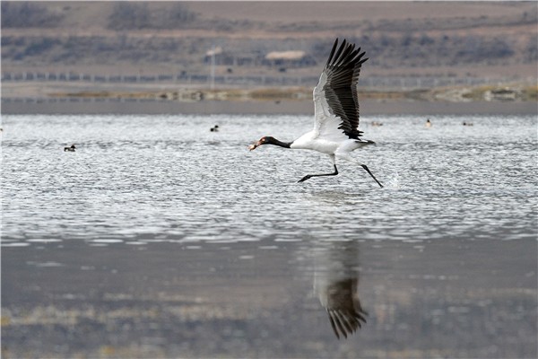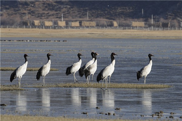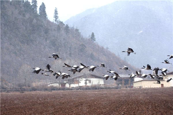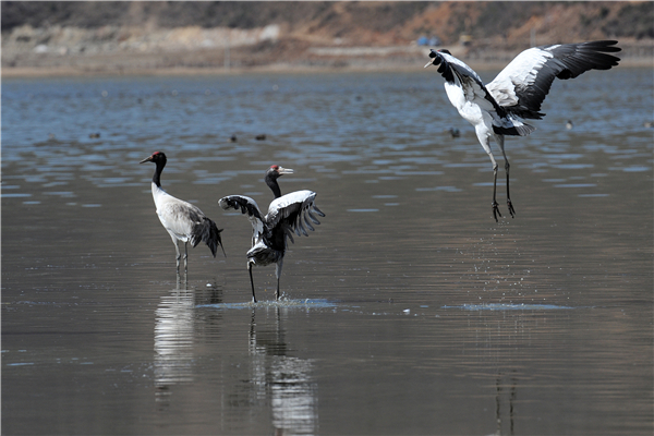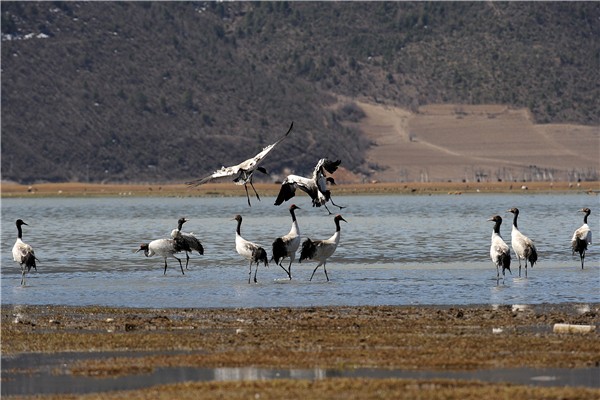 成群結(jié)隊的黑頸鶴自由嬉戲