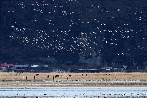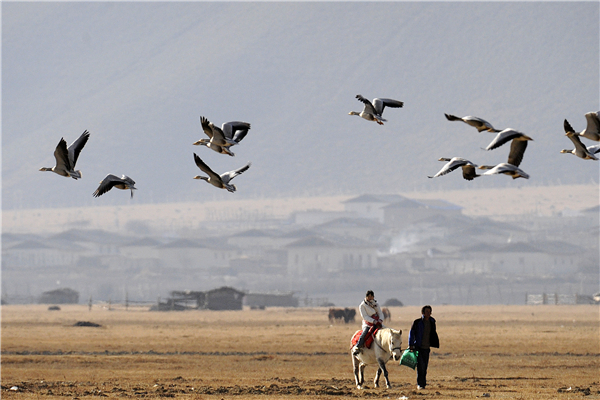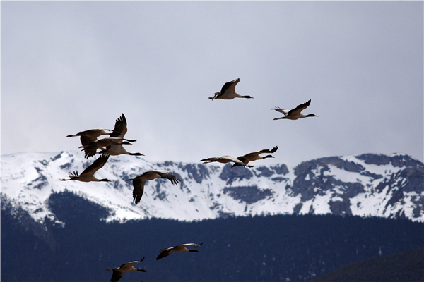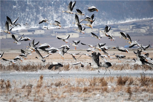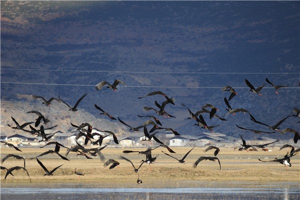 香格里拉的越冬鳥集群大、珍稀類眾多,按中科院統(tǒng)計,每年到此越冬的鳥類達(dá)198種,加上“土著鳥”,數(shù)目就更可觀了。不少珍稀鳥類在其他地方是很難見到的,比如斑頭雁、黑鸛、白鶴、金雕、灰鶴、黃鴨、高山禿鷲等。