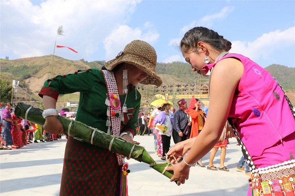 目瑙縱歌場上,景頗族婦女將竹筒中的特色景頗水酒敬給來賓以及舞者。
