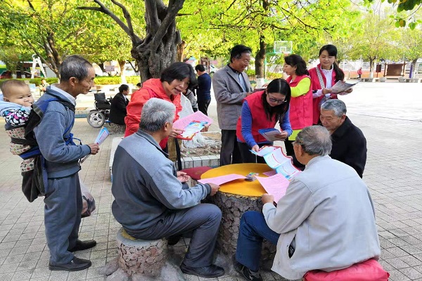 國家監察體制改革一周年之際,華坪縣紀委監委成立宣傳小分隊,走上街頭,為廣大群眾耐心、細致宣傳講解監察法。(吳燕 攝)