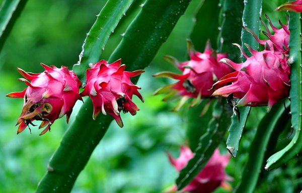 火龍果果實呈橢圓形,外觀為桃紅色或紫紅色,遠看像一個火苗,近看像一個大火球,感覺如“噴火的龍”。