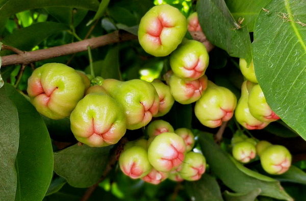 蓮霧周年常綠,果形美,果實呈鐘形,果色鮮艷奪目,外形就像一個掛著的鈴鐺,一陣微風吹來蓮霧便散發出它那略有蘋果的香氣。