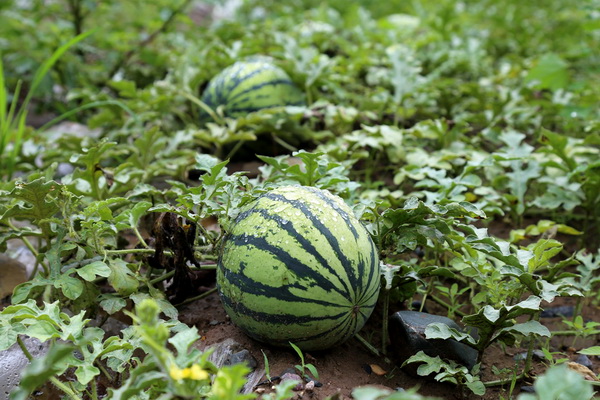 圓圓的西瓜,像個大皮球,它外表是深綠和青綠相間的花紋,好像穿著一件非常漂亮的花衣裳,西瓜的尾部還有像豬尾巴似的瓜藤。