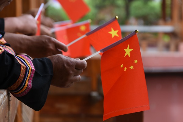 鎮沅縣恩樂鎮少數民族紀委干部及村監督委員會主任揮動著五星紅旗為祖國歌唱,祝福祖國70歲生日快樂。(陳航 攝)