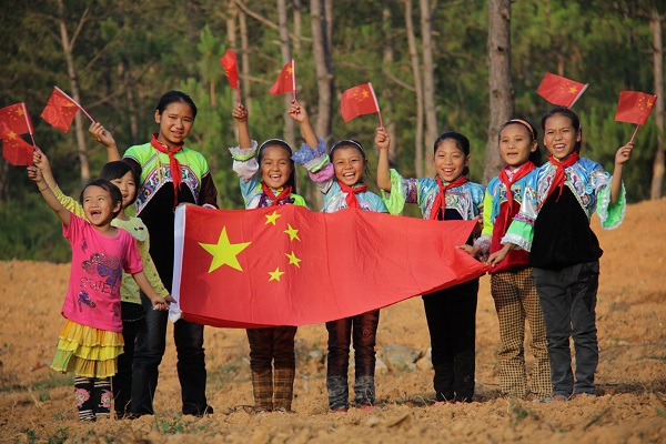 硯山縣的孩子們笑容燦爛,五星紅旗與胸前的紅領巾融為一體,甜甜的笑容滿含著對祖國的祝福。(鄢躍美 攝)