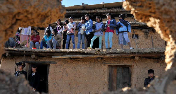 帶著一臉喜悅、身著哈尼服飾的新郎和伴郎正在土掌房門口迎接新娘。屋頂上,身著現(xiàn)代服裝的女孩在滿臉期待地觀望這場(chǎng)具有濃郁哈尼特色的傳統(tǒng)婚禮。