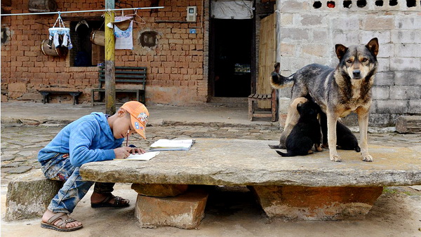 一哈尼男孩在土掌房前用石板搭建的天然桌子上低頭認(rèn)真寫著家庭作業(yè),他的“同桌”是與他形影不離的母狗和正在吃奶的小狗。