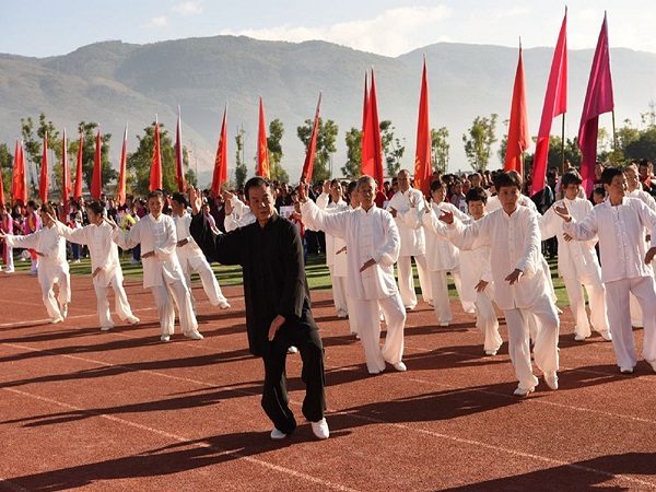 石屏縣老紀檢監察干部在工作之余參加太極表演,動靜結合,剛柔相濟,一招一式,揮灑自如。(周永偉 攝)