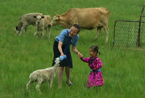 紀檢監察人在工作之余陪伴家人來到牧場,帶著孩子一起喂小羊喝水,感受大自然的魅力。(楊杰 攝)