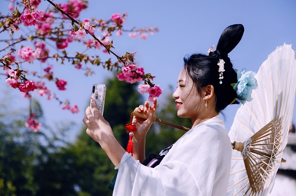 穿上漢服,撐起紙傘,留下青春的身影……平時里英姿颯爽的紀檢監察女干部在周末的休閑時光中,也像那枝頭嫵媚的花朵一樣嬌艷可愛。(薛興業 攝)