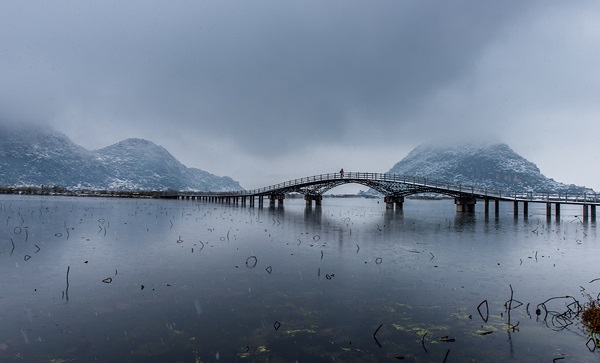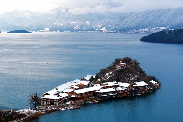 寒潮來襲,一場紛紛揚揚的大雪,把高原明珠瀘沽湖裝扮得更加嫵媚動人,青黛湖山隱約在靜謐的畫卷中,空靈寫意。(楊大發(fā) 攝)