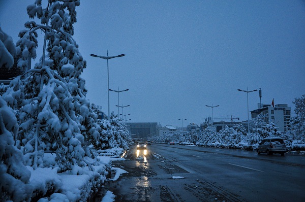 大雪過后的清晨,道路兩旁的大樹一夜之間換成了整齊的銀裝素裹。趕早班的人們小心翼翼地駕駛著車輛行走在結了冰的路面上,車輛中透出來的燈光仿佛是溫暖這冰雪世界的點點微光。(羅鵬 攝)