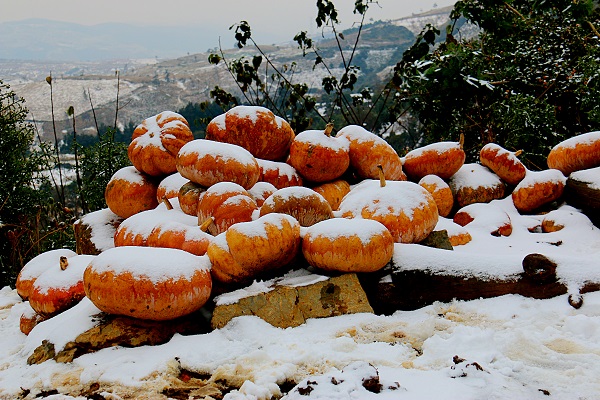 冬天的村莊靜謐唯美,放眼望去遍山皆雪,皚皚白雪下的金黃南瓜,更為這銀色的世界增添了一抹亮麗的色彩。(廖吉安 攝)
