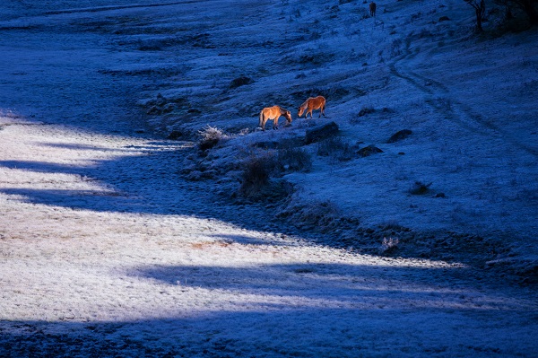 白霜覆蓋的草地上駿馬散步,不遠處的山坡上,青黃相接的草,紅綠交織的葉,還有石頭上碧綠的苔蘚,仿佛同時置身于多個季節(jié)。(賈雷 攝)