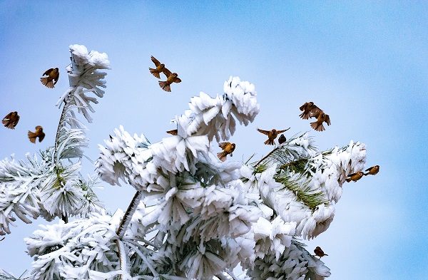 隨著一場冬雪的降臨,樹梢上面雖冰凌覆蓋,但仍有幾只“雪地精靈”在空中飛舞覓食,映著山中雪景,一切如夢似幻,充滿生機。(康關福 攝)