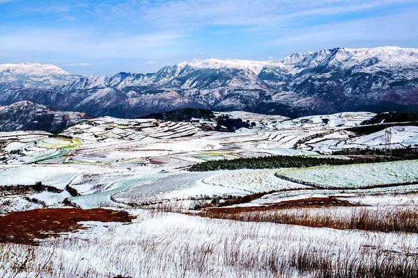 冬至?xí)r節(jié),地處高寒山區(qū)的東川區(qū)紅土地銀裝素裹,紅土、白雪交相輝映,美不勝收。(王榮 攝)