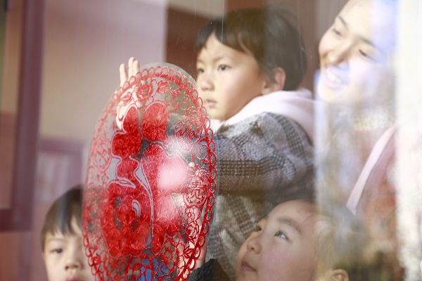 每一個鮮艷的福字都映出幸福的火花,每一個光暈都映出如夢的七彩童年。云南大理璞心自然幼兒園的孩子們貼窗花慶祝元旦。(劉昆 攝)