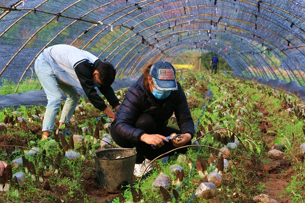 一排排、一簇簇的羊肚菌在陽春三月?lián)伍_了褐色的“小傘”,伴著沁人心脾的菌菇香,村民們戴著口罩在大棚內(nèi)忙著采收,滿是豐收的喜悅。(張芹洪 攝)