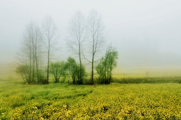 春分時節(jié),晨霧籠罩著金色的田野,將云嶺大地妝扮成一幅美麗的畫卷。(武敬周 攝)