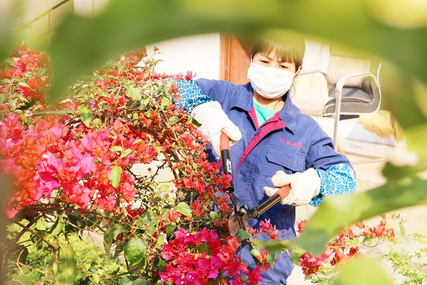 南華糖廠的工人正在廠區(qū)里忙著為三角梅修枝,只盼這個春天花朵開得更燦爛,呼應(yīng)那句春“分”得意。(穆王成 攝)