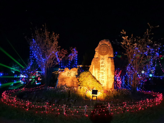 隨著夜幕降臨,阿廬風景名勝區各種色彩的燈光依次亮起,神秘原始的阿廬部落文化折射出一片神奇的光輝和色彩,吸引著眾多國內外游客。(岳艷 攝)