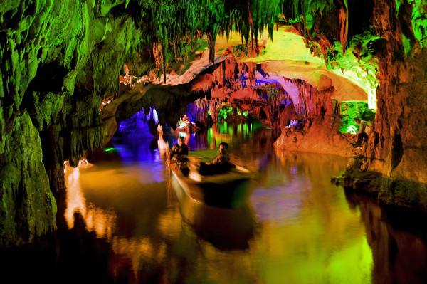 乘著小巧精致的游船游覽觀光,洞里金碧輝煌,七彩斑斕,一灣碧水,清幽迷人,詩情畫意的景致沁人心脾,仿佛置身仙境。(黃光明 攝)