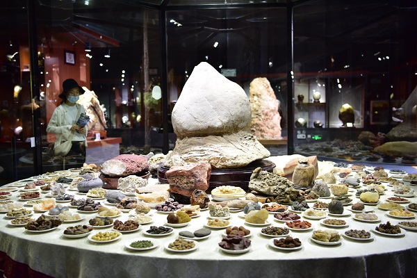 參觀者在一桌的石頭宴前細(xì)細(xì)欣賞。這桌石頭宴整整216道菜,南北佳肴、八珍玉石無所不有,每盤菜都形態(tài)逼真、色澤誘人,讓人看得垂涎欲滴。(李抒璠 攝)