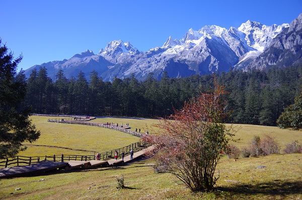 雄偉壯觀的麗江玉龍雪山,積雪終年不化,成片的云杉草甸吸引游人紛至沓來,駐足欣賞,流連忘返。(楊向紅 攝)