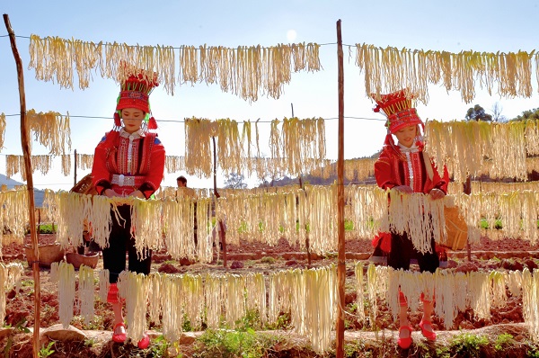 芒種時節的紅土地里幽香撲鼻,勤勞美麗的彝家姑娘在烈日下細心整理晾曬著一根根青翠透亮的蘿卜絲,用一雙雙靈巧的雙手精心編織著平凡生活的幸福畫卷。(普學和 攝)