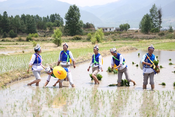 芒種芒種,幸福播種。在大理州洱源縣鳳羽鎮的壩子里,一群身穿白族服飾的婦女唱著白族調,正在歡快地插秧,播種下希望,辛勤耕耘將得碩果。(年耀紅 攝)