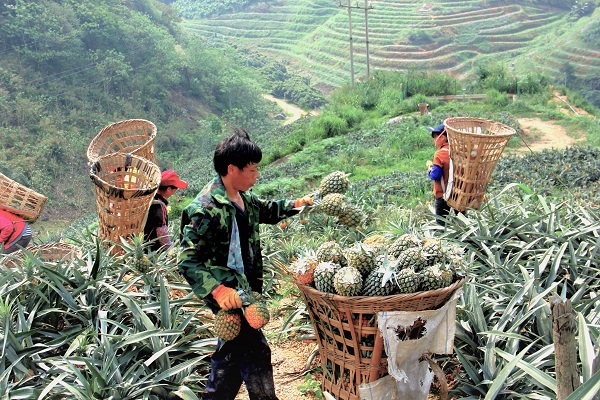 芒種前后,在紅河州河口縣老范寨鄉迎來菠蘿豐收,本地企業、農戶積極組織工人采收菠蘿,田間地頭一派繁忙景象。(鄧林耀 攝)