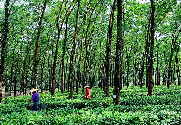 綠色橡膠園里閃現著膠工忙碌的身影,辛勤的汗水換來潔白的膠乳。(潘泉 攝)