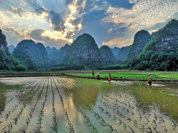農戶搶抓農時栽插秧苗,為田間披上新綠。(袁翠華 攝)