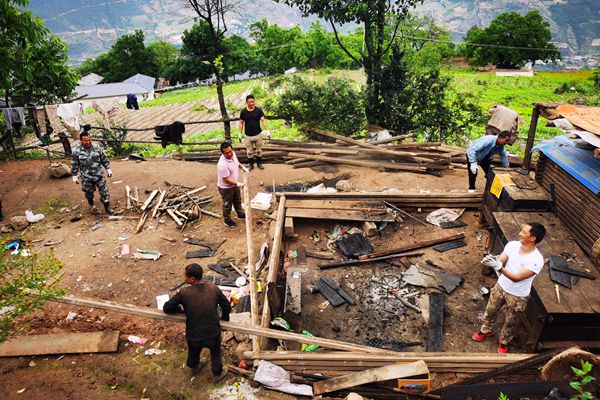 蘭坪縣紀委監(jiān)委干部幫助搬遷群眾拆除舊房。(胡小濤 攝)