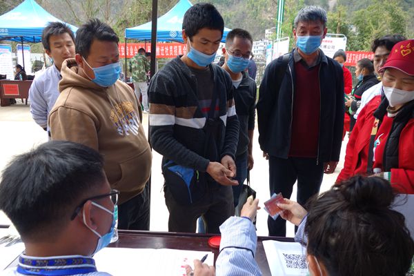 州紀委監(jiān)委派駐州委辦紀檢監(jiān)察組組長、福貢縣城易地搬遷點新增勞動力轉移就業(yè)小分隊成員熊國勝向搬遷群眾介紹務工信息。(福貢縣城易地搬遷點新增勞動力轉移就業(yè)小分隊供圖)