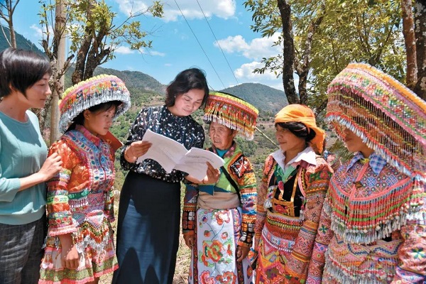 永平縣紀委監委深入到水泄鄉世興村開展廉政文化進農村宣傳教育活動,將廉政教育、政策宣傳延伸到基層一線、滲透到千家萬戶。圖為紀檢監察干部在向少數民族群眾普及廉政文化知識。(永平縣紀委監委 楊紅艷/攝)