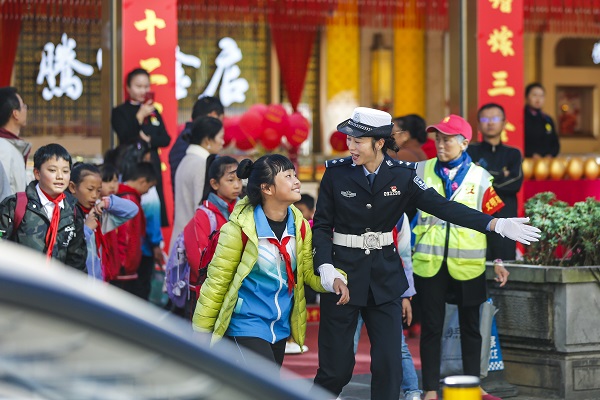 騰沖市公安局交警大隊民警在學校門口指揮交通,護送孩子安全上學放學。(段宇明 攝)